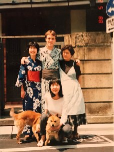This photo was taken in front of the Nakatani’s home in Koiwa. Chieko is to my right and her mom to my left. Her sister Yumi is crouching down with their two dogs whose names I can’t remember. Chieko’s mom made me the yukata I’m wearing in the shot. Chieko was attending a woman’s college, Yumi worked as an illustrator for an advertising company and her mom was a housewife. Chieko’s dad worked in administration for a large Japanese department store.