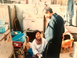 Chieko’s mom and dad in the courtyard outside their house; Koiwa, 1988