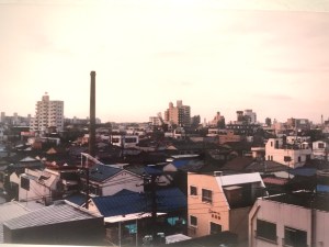 The smoke stack you can see in the left of the photo belonged to a sento, or public bath, which were still very common in that part of blue collar Tokyo in those days where many families traditionally didn’t have a shower or bathtub.
