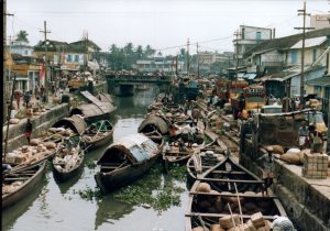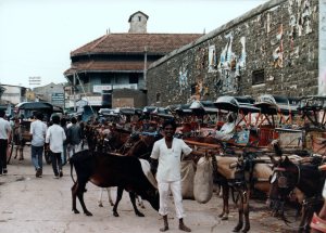 I can’t recall where this town is, but it’s most likely either Kochi or Alappuzha (called Cochin and Alleppey at the time; many Indian towns and cities have reverted to their pre-British names since the ’80s). Kerala has a long coast on the Arabian Sea and many rivers so you’re not far from water wherever you go. This was a common scene back then, laborers loading and unloading open boats on the canals or at the docks. Kerala has changed dramatically since then—developed, I suppose—and scenes like this are now rare.