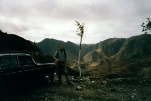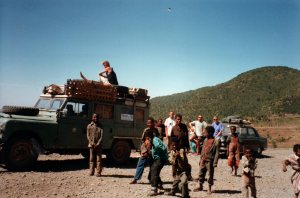 I spent two months in Ethiopia and Eritrea in the winter of 1993/94, traveling from the border with Kenya up to the border with Sudan and back down again. For a time I traveled in a Land Rover with two Australians, Rob and Fiona (Fi), and a trio of New Zealanders driving the little brown car you can see in the background in the photo below. Ethiopia is very popular now with travelers and well established on the backpacking circuit, but when I was there in 1993 it had just finished its long war of independence from Eritrea and foreign travelers were only starting to trickle in. Eritrea itself had only been recognized as an independent country a few months previously. It was all brand new.