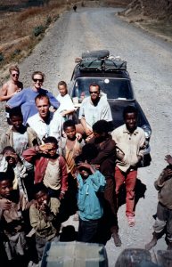 I spent two months in Ethiopia and Eritrea in the winter of 1993/94, traveling from the border with Kenya up to the border with Sudan and back down again. For a time I traveled in a Land Rover with two Australians, Rob and Fiona (Fi), and a trio of New Zealanders driving the little brown car you can see in the background in the photo below. Ethiopia is very popular now with travelers and well established on the backpacking circuit, but when I was there in 1993 it had just finished its long war of independence from Eritrea and foreign travelers were only starting to trickle in. Eritrea itself had only been recognized as an independent country a few months previously. It was all brand new.