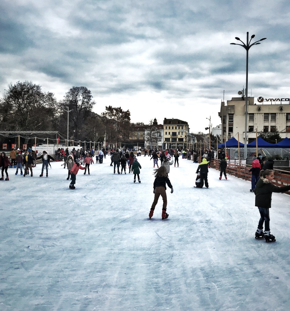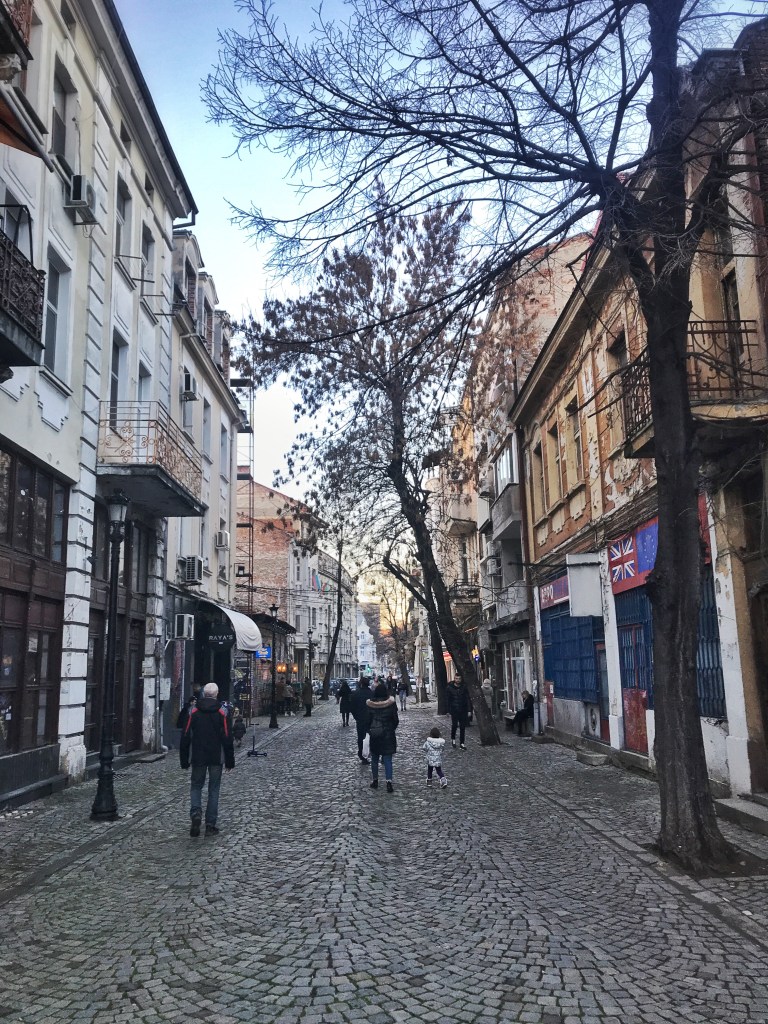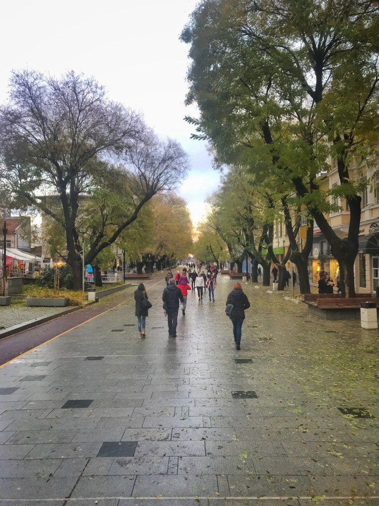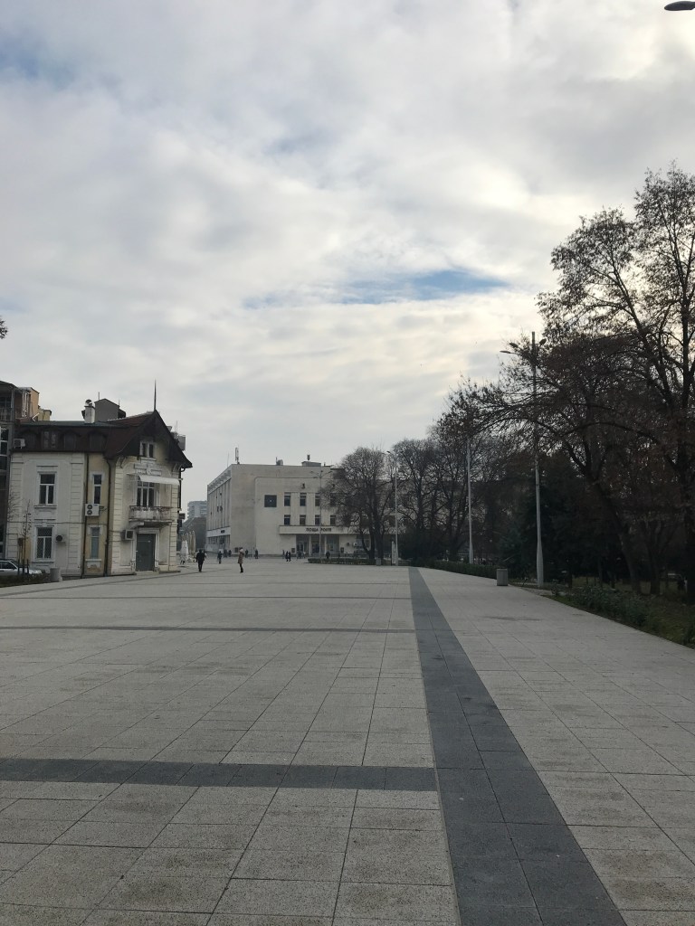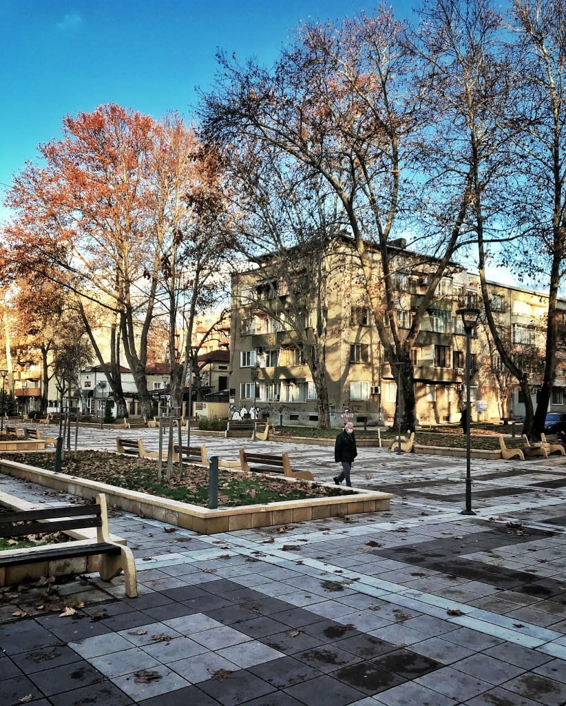 Much of the country is rural, and very pretty. Every town has a central pedestrian area lined with benches and (in normal times, and outside of winter) cafe and bar tables. Whoever won the contract to supply Bulgarian towns with park benches must be on the Forbes 500 list because I’ve never seen so many places to sit outdoors. And the density; I don’t know if there’s a universal standard for bench spacing, but if there is Bulgaria ignores it. Pedestrian streets and parks are lined with literally hundreds of park benches spaced no more than a meter or two apart; and despite it being winter when I was there, any hint of a bit of sun or warmth sent hardy souls outside to a bench with coffee, cans of beer and sandwiches. Every place was like that: head to the center of town and sure enough, there would be a (sometimes very large) area of closed-off and pedestrianized streets, filthy with benches.