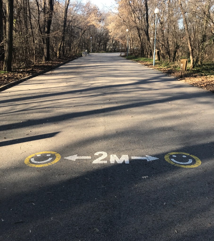 Mask wearing was mandatory inside any building or shop, and outdoors when you couldn’t stay at least two meters distant from other people. Bulgarians were very good about indoor mask wearing, though there appeared to be more flexibility when outdoors. Many folks wandered around with masks down around their chins, then yanked them as they entered a shop (which is the opposite of Albania where locals removed their masks when they went indoors, better to greet your neighbor and kiss his cheeks). There were restrictions on the number of people who could gather in groups outdoors, though I’m not sure it was enforced. I saw fairly large groups (15 or so) of mainly young people all chatting together, drinking coffee and smoothies as they walked through the streets and sat together on park benches.