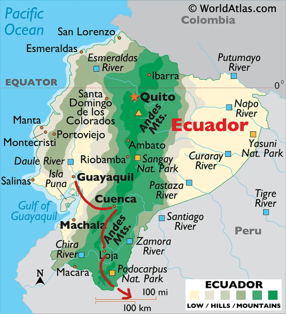 My route through Ecuador: Guayaquil, Cuenca, Loja, Villacabamba, and Zumba, then into Peru.