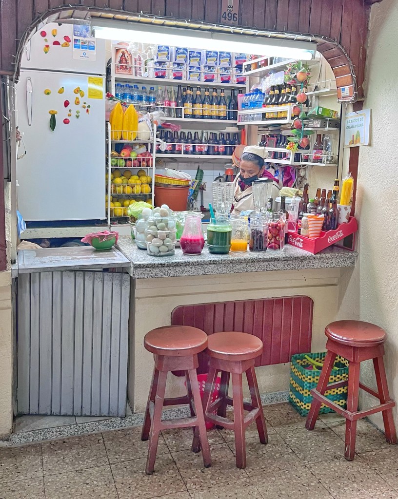 Drinks kiosk in the market in Cuenca. Fresh fruit and vegetable juices were cheap and tasty.
