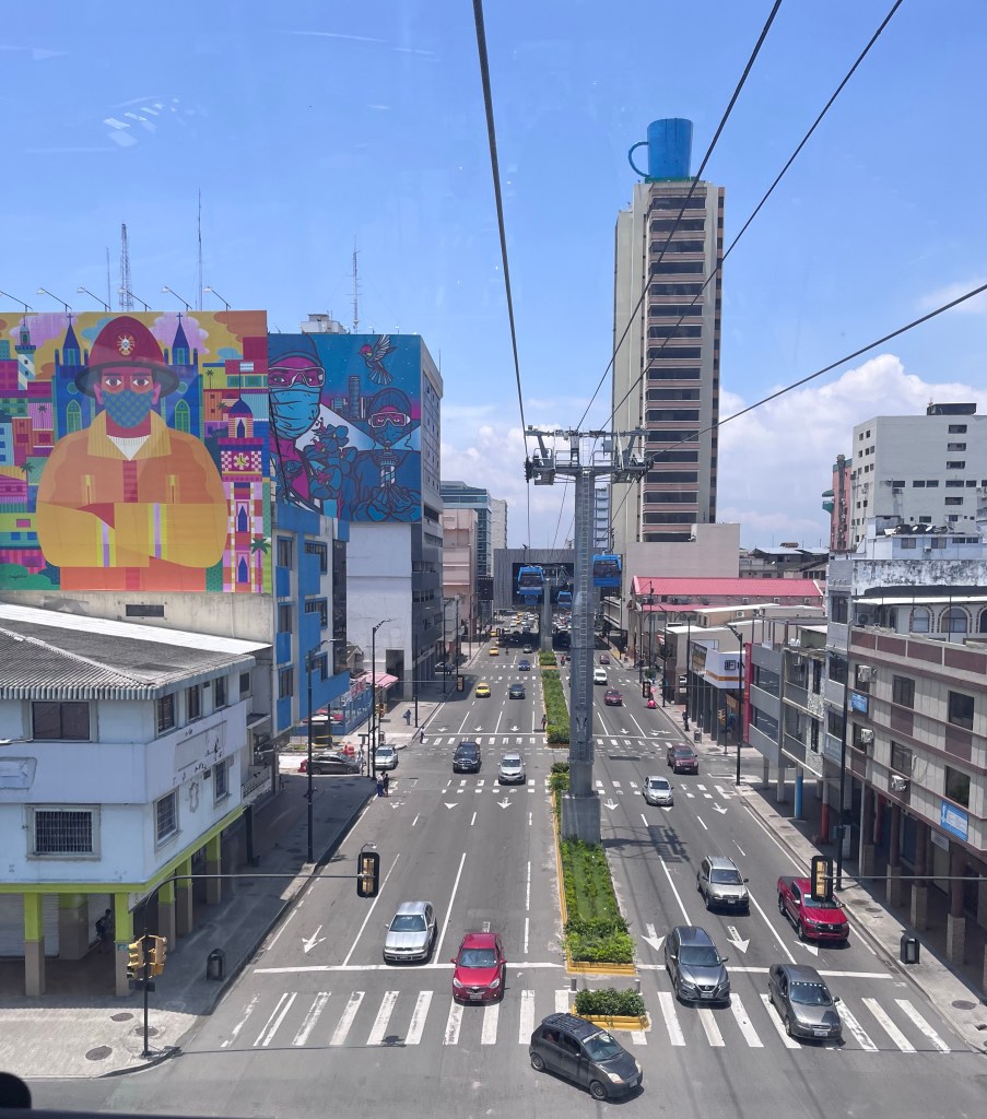 Like many other South American cities there’s a cable car. The one in Guayaquil travels through downtown, then continues across the wide and fast moving Guayas River, very low, just above the water, which is really cool. It’s a great way to see Guayaquil, and you get a lovely cool breeze as you float above the city. Most of the downtown core is fairly clean, but there are a lot of abandoned buildings and closed shops, and a lot of people camping out on the streets or simply hanging around. The downtown area isn’t well lit away from the malecón, so I found the city a bit dodgy and unappealing. It didn’t make a good introduction to the country.