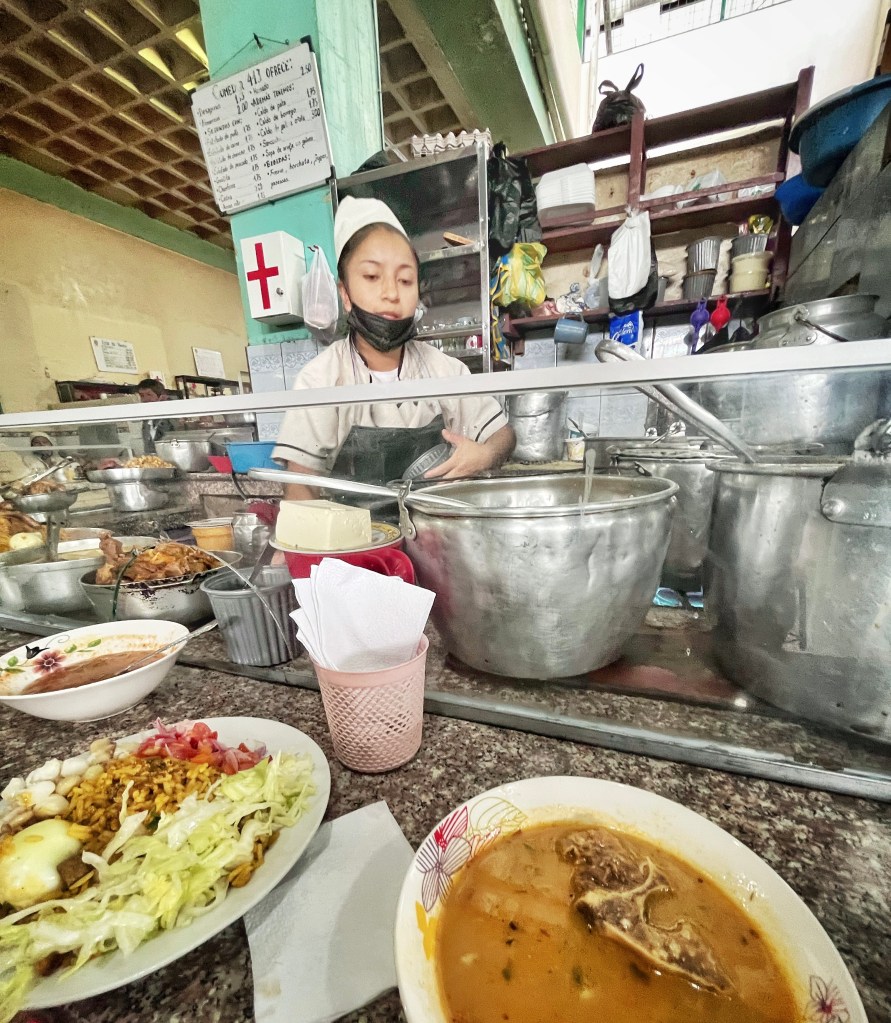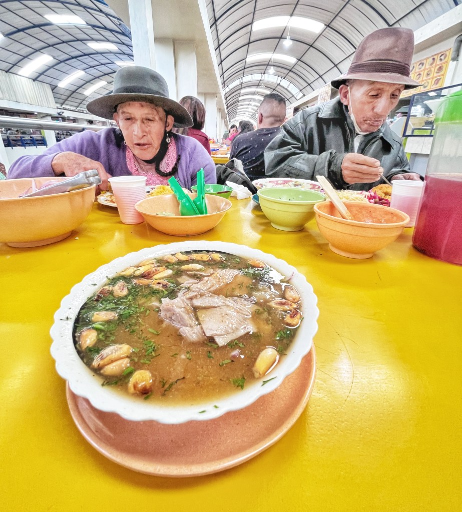 Sharing my table in the Cuenca market with a couple from the countryside while enjoying a delicious bowl of encebollado.