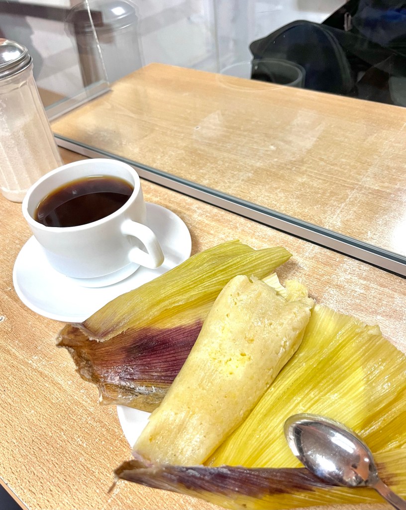 A tamale and cup of coffee for breakfast at the bus station in Guayaquil.