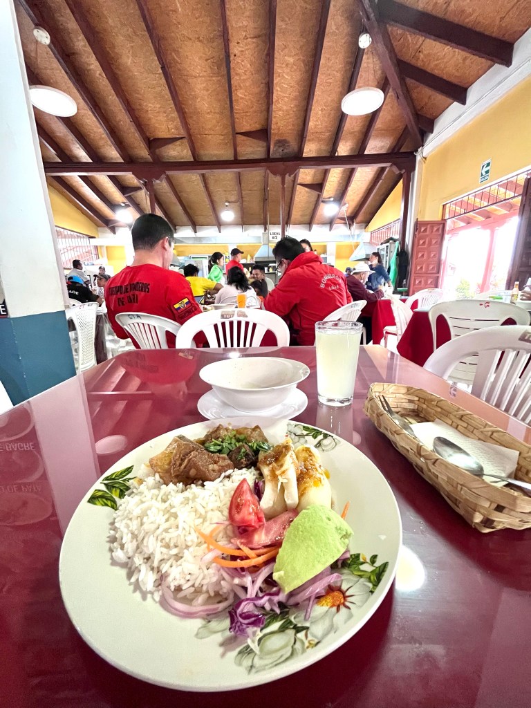 The food is outstanding, and is a real highlight of travel in Ecuador. I’d say Peru has the edge on overall quality and variety of dishes, but Ecuador comes in a close second. Seafood favors prominently, even in the mountains. The system works more or less the same as in neighboring countries: you sit down at a table and are brought a soup, often something very hardy, closer to a stew. Then you choose between a couple of main dishes which might include fried liver, chicken in a tangy gravy, fried fish, sausage, roast chicken or fried rice. Most dishes come with some combination of potatoes, yuca (cassava), beans, rice, plantain chips, and salad. You can choose pop or a delicious fruit juice to wash it all down.
