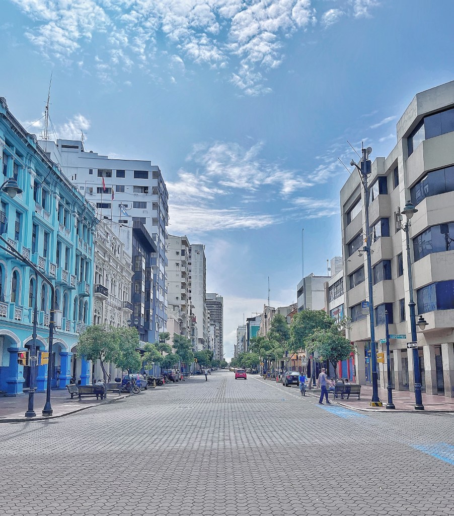 The clean and tidy streets of the commercial district in Guayaquil on a quiet Sunday morning.