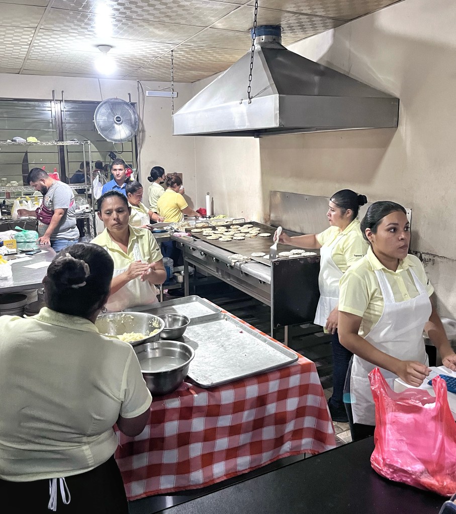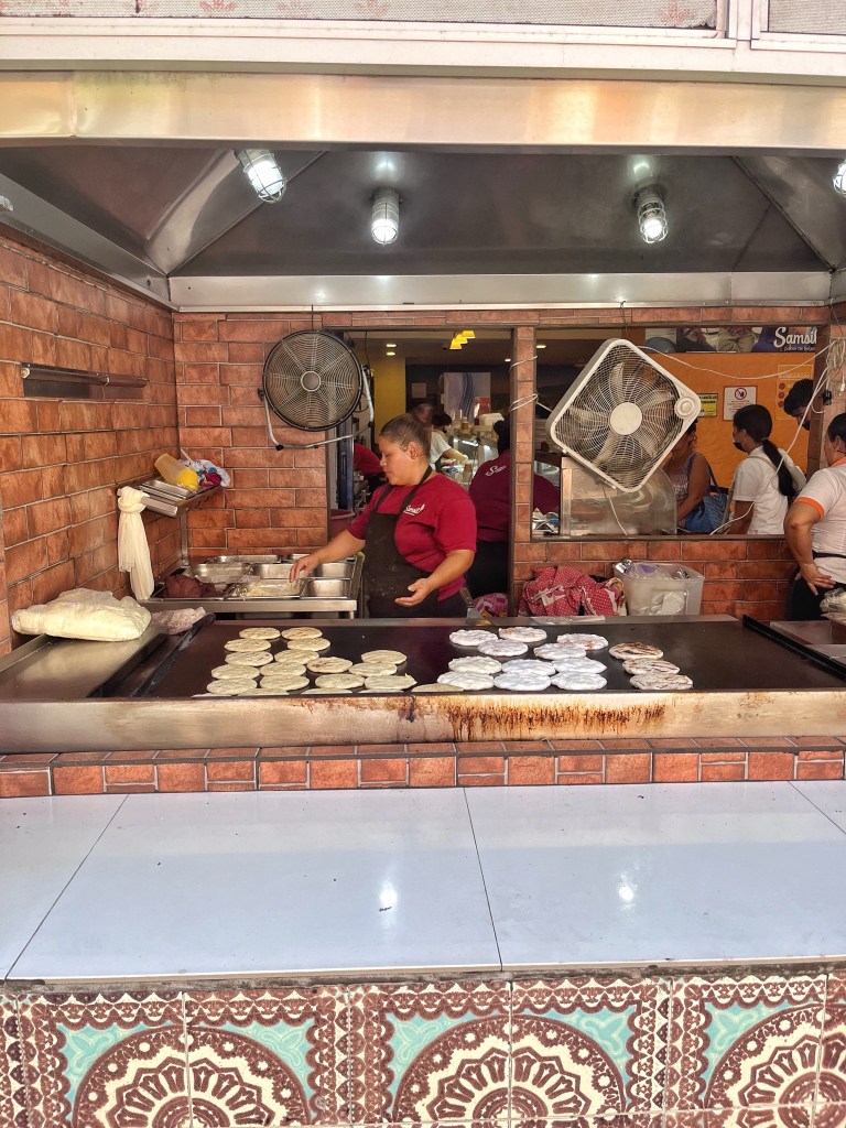 Most often the pupusas come filled with cheese, chicharrón (pork rinds), squash, or refried beans. Some of the bigger places offer different fillings, like spinach, carrot, or loroco, a kind of climbing vine with edible flowers, my favorite. You can get a pupusa nearly anywhere, from busy sit-down restaurants, small cafes, and even in front of people’s’ homes in the evening where a housewife and daughter will set up a griddle and cook pupusas for a few hours. They’re extremely filling, and comically cheap at around forty cents each. Big fancy ones with exotic meat fillings will set you back a dollar.